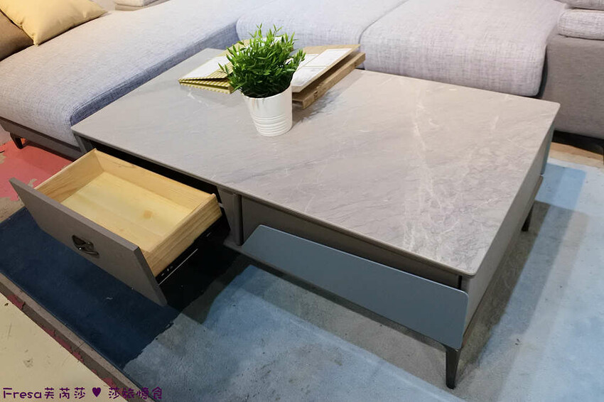 茶几顏色很美,上頭紋路簡單有質感,側邊櫃體的顏色及裝飾也相當有設計感.