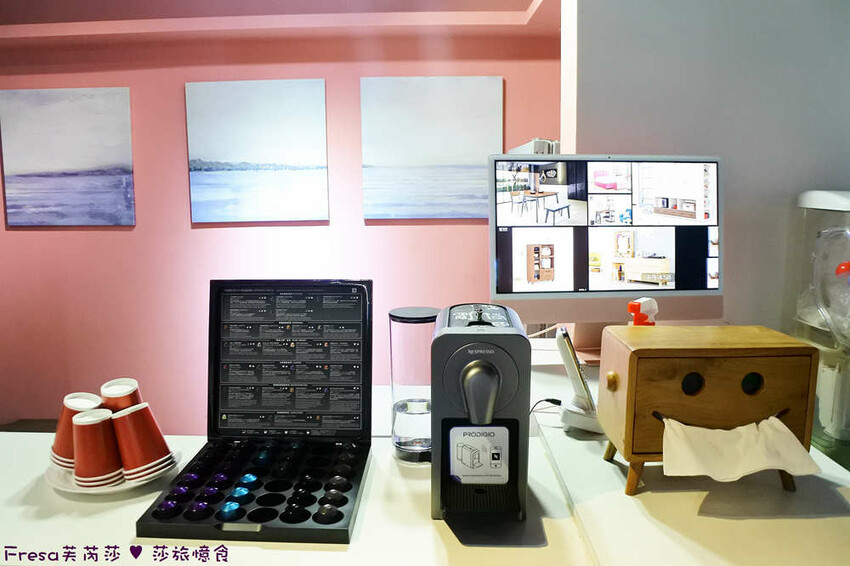 億家俱,另個貼心小檯,有膠囊咖啡、汽水、果汁和各樣餅乾,都隨客人自由取用.
