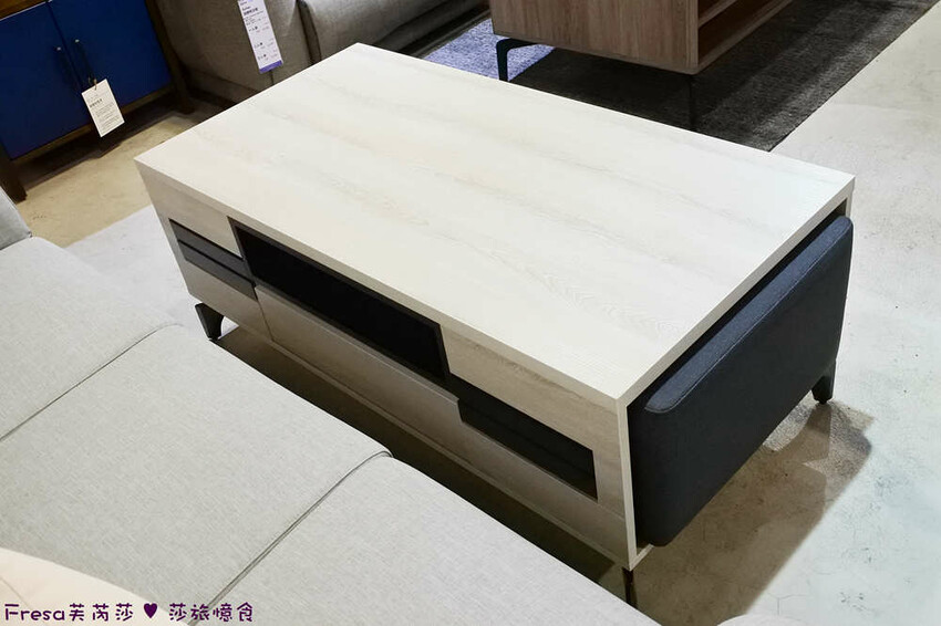 多功能性的茶几,側邊可放一張小沙發凳,前後有多個抽屜可置物收納,方便小居家使用.