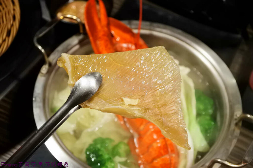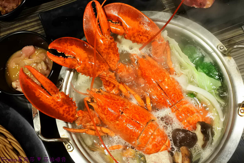 二尾龍蝦把湯鍋占得滿滿滿,好像在泡澡一樣,也太享受.