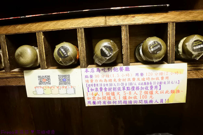 牆面上有放置各種調味料罐和面紙,以及吃到飽費用時間說明.