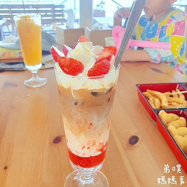芒果冰沙和鳳梨果汁,話說我一開始沒注意到老闆有草莓季商品,就單純點了菜單上的飲品。後來看到別桌拿著一杯草莓飲品前前後後三個人拍了15分鐘,還換了好多位置、好多角度,讓我超級羨慕,點什麼鳳梨汁阿