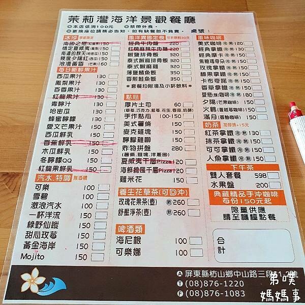 周一~週日早上九點到晚上六點都有營業,重點是寵物友善餐廳喔!! 低消100元,不限時間,真的是長途開車來到墾丁能好好休息吹冷氣、看海景的地方