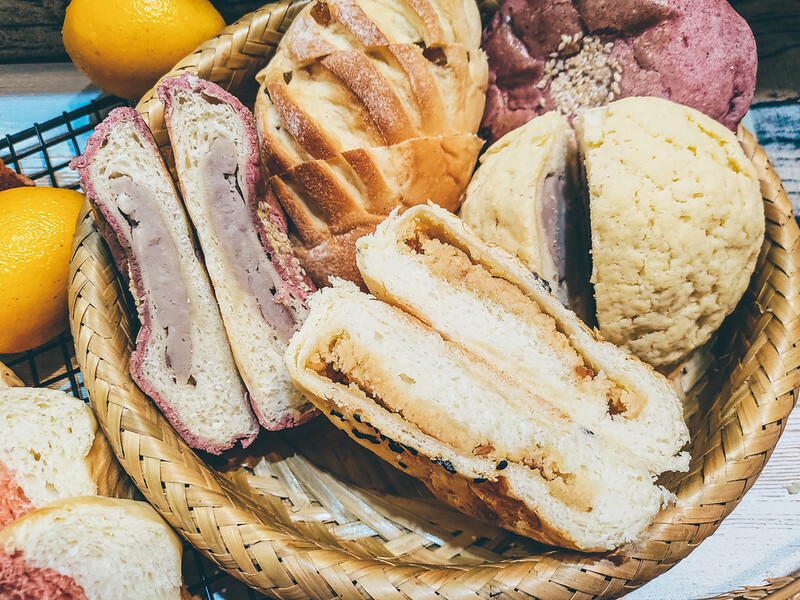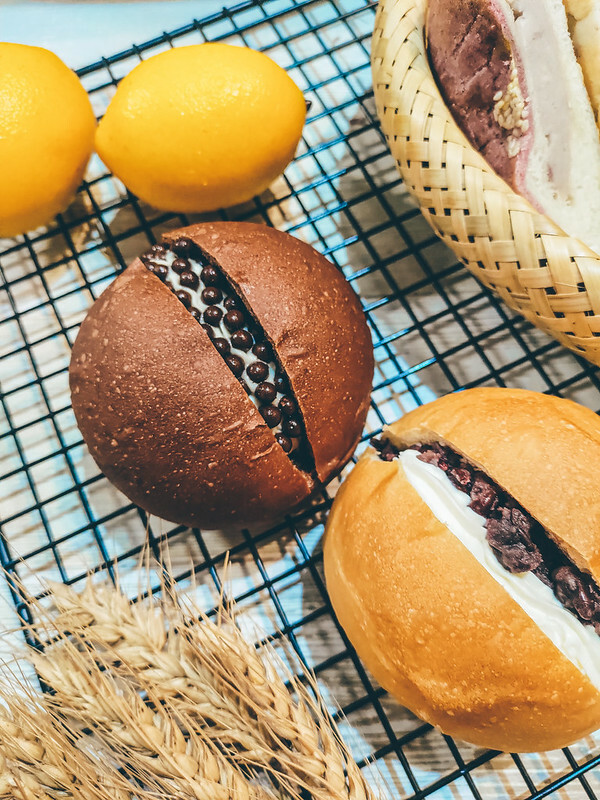 法芙娜可可球草莓生乳包、花生牛奶酥皮麵包。