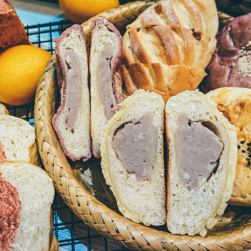 這次店內銷售的麵包口味有大甲芋頭菠蘿、香草蜜桃軟歐包、紫薯芋頭酥皮麵包