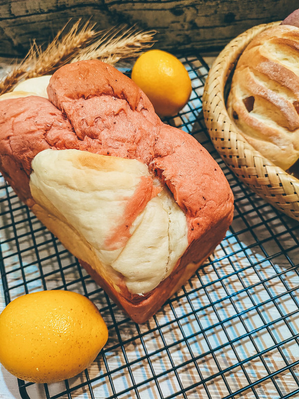 從外觀看是雙色的吐司,切面層切開是粉紅跟白色揉合而成的兩種顏色,