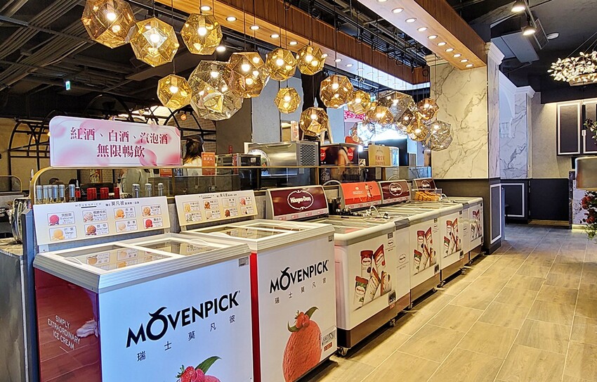 自助飲料歡樂吧旁還有濕式熟成肉塊展示櫃以級各式紅白酒,歐洲Bar Roya青蘋果氣泡酒,荷蘭原裝進口鮮榨海尼根與台灣生啤酒無限暢飲,更首度加碼引進美國紅點手工鮮釀啤酒Redpoint Brewing Company最受歡迎的「喝起來」與「台.P.A.」2款頂級手工啤酒,免費升級暢食暢飲。