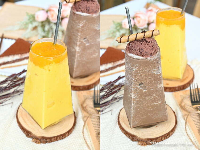 採用整顆新鮮芒果及自製芒果醬下去打成的芒果冰沙,芒果香氣濃郁,還吃的到微微芒果果肉,另一杯摩卡拿鐵冰沙,採用兩份濃縮咖啡液及巧克力醬下去打成的冰沙,上頭搭配巧克力冰淇淋,濃濃的巧克力香氣伴隨著嘎逼的香氣,好喝不甜膩