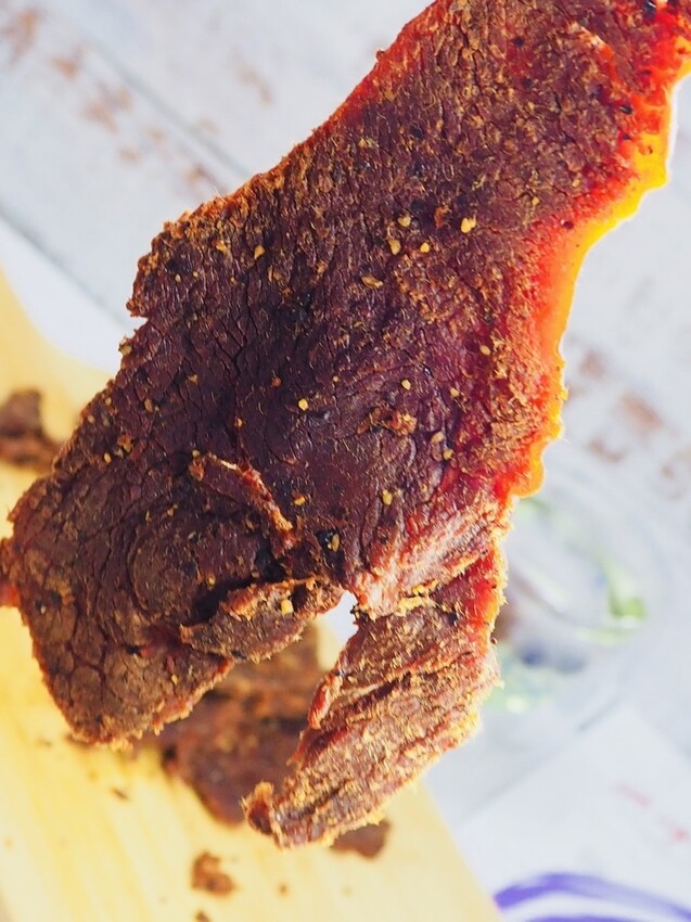 肉眼還能看到顆粒的胡椒粒在牛肉乾上,跟著肉乾一起吃進嘴裡,嘴裡馬上散發出美妙的辛香口感。