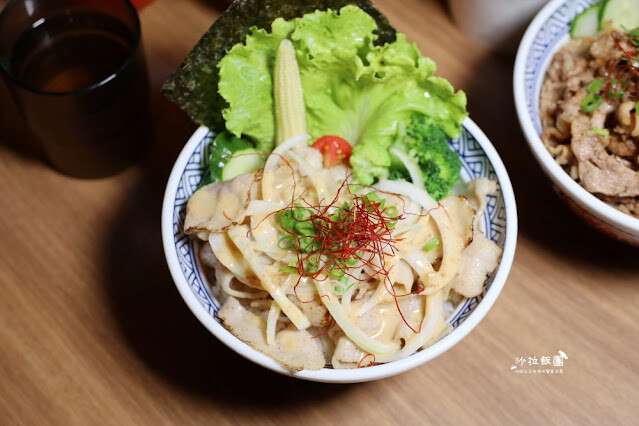 吃肉也要吃點蔬菜搭配,丼飯中有玉米筍、小黃瓜、生菜、青花菜、洋蔥..等配菜(蔬菜請以當天供應為主),營養均衡