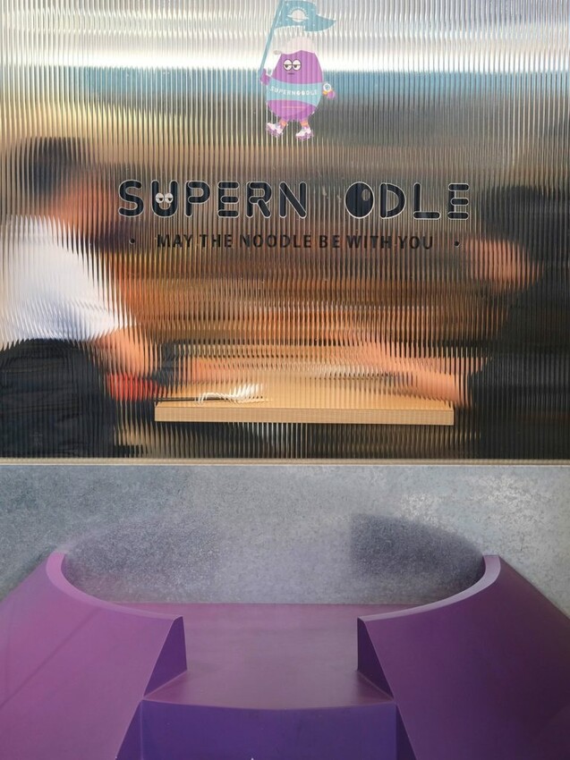 ▼【七七製麵研究總署】 以可愛的太空人為LOGO,進店後首先看到漂亮的候位區,亮眼的橘色皮椅沙發坐起來舒適,對面則是一座紫色的火箭發射台,並且採取自助點餐模式,從待機畫面都符合太空主題,讓點餐過程變得有趣又好玩,餐點也都可以做客製化調整。