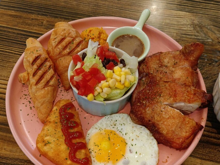 有兩塊可頌+生菜沙拉+煎雞腿+地瓜泥+太陽蛋+薯餅