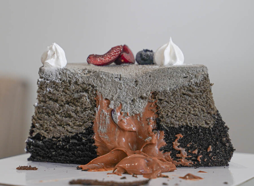 爆漿流竄的比利時可可布蕾會滋潤戚風蛋糕,讓蛋糕更順口好吃