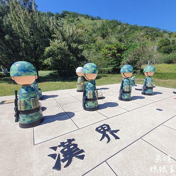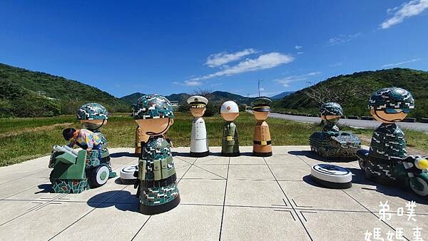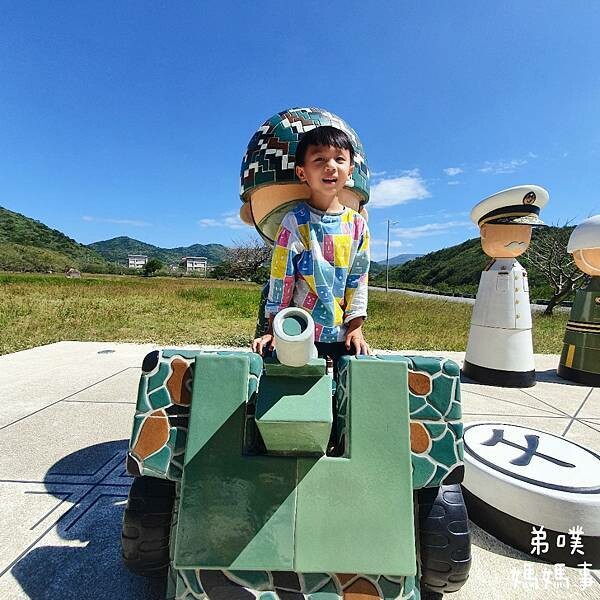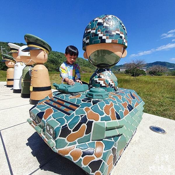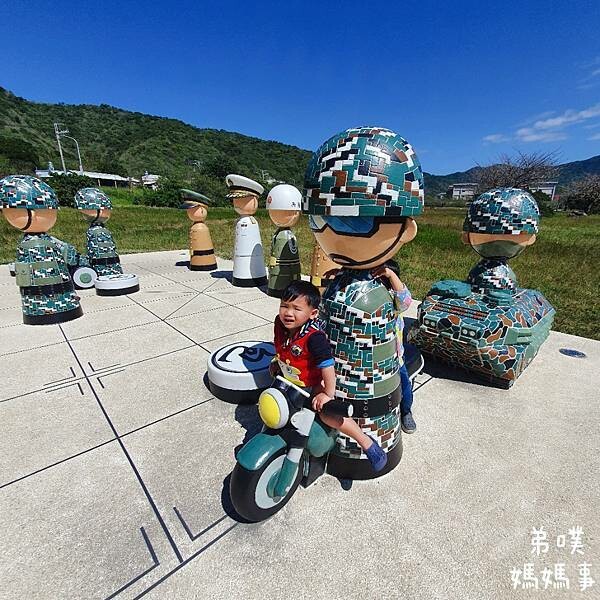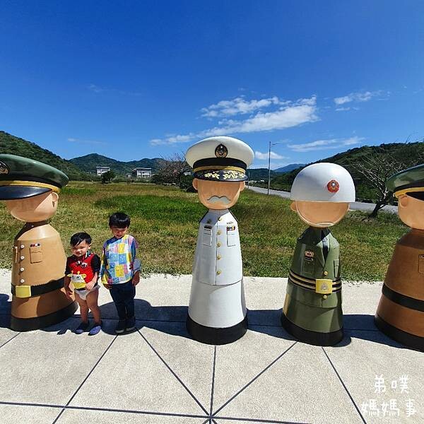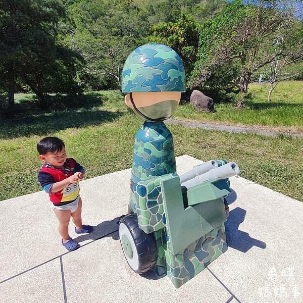 今天天氣超好,雖然太陽超大,孩子們一看到可愛的軍棋大娃娃,完全直接衝下車。這裡就位在前往四重溪的交叉路口,周邊沒有遮蔽物,但孩子完全不受影響。