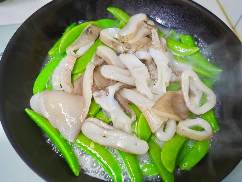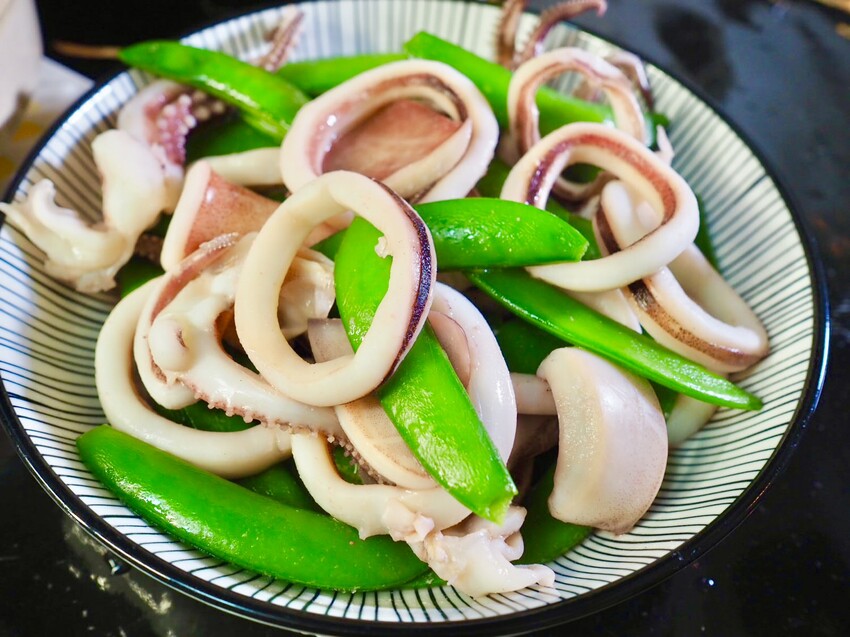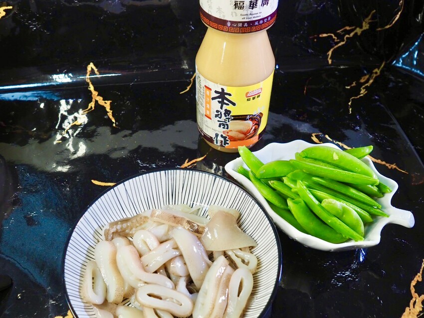 肯定會讓人多吃一碗飯的偷飯菜,甜豆吸入滿滿的雞汁高湯,搭配新鮮Q彈有嚼勁的魷魚切塊,讓口感即層次更加豐富。
