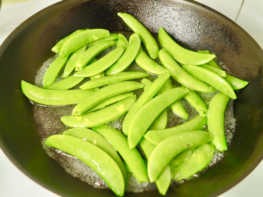 1.甜豆大火快炒並加入『福華牌雞汁湯寶』5cc,清水100cc,一起煮入味。