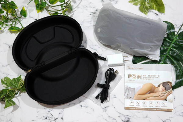 收到的伊亞索3D電熱眼罩,還有附送收納盒、外出好攜袋、磁吸電源線、USB供電插頭及說明書,配備還蠻齊全的。
