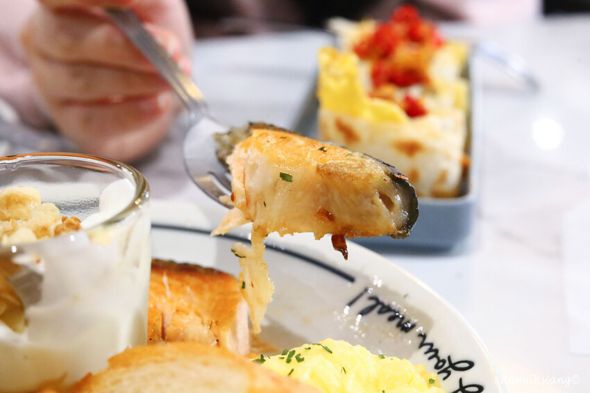 鮭魚很好入口,一戳馬上就能拿起來,魚刺很少很好咬~搭上主廚麵包鹹鹹微甜好滋味很搭