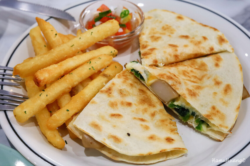 餅皮很酥有嚼勁,裡面的起司與野菇搭配不會很膩,菠菜又讓這道增添口感,隨餐還有付個莎莎醬
