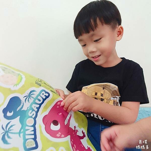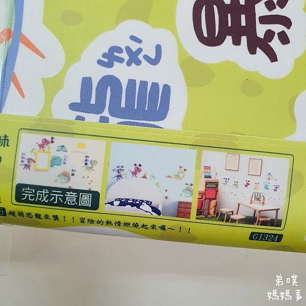 一打開有兩張恐龍探險隊圖樣,圖案是台灣設計師設計,內含45個小元件,有孩子愛的暴龍、迅猛龍、雷龍、三角龍、劍龍、副櫛龍,再加上恐龍蛋、恐龍腳印、樹林等等,讓房間一秒來到侏儸紀世界