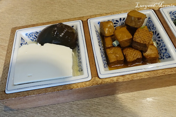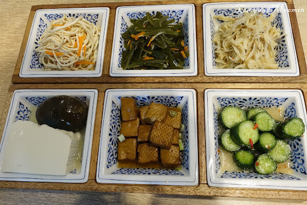 涼拌干絲、涼拌海帶絲、牛蒡絲、蜜豆干、涼拌小黃瓜與皮蛋豆腐。