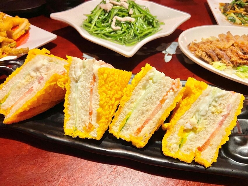 把蝦肉混入沙拉醬內,與吐司一起油炸,除了香味可口,夾層裡面還有一些生菜黃瓜片及番茄片,好吃又不油膩。