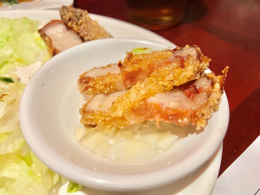 五花肉酥炸後,紅澤滑嫩的燒肉吃起來完全不會油膩,香味濃郁,外酥內軟的好滋味。