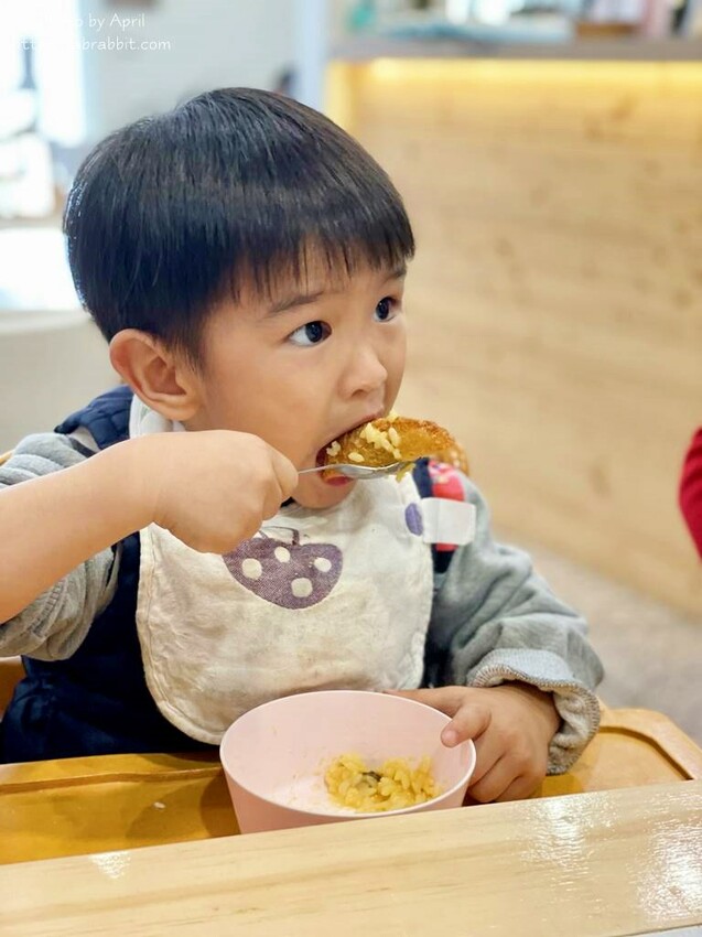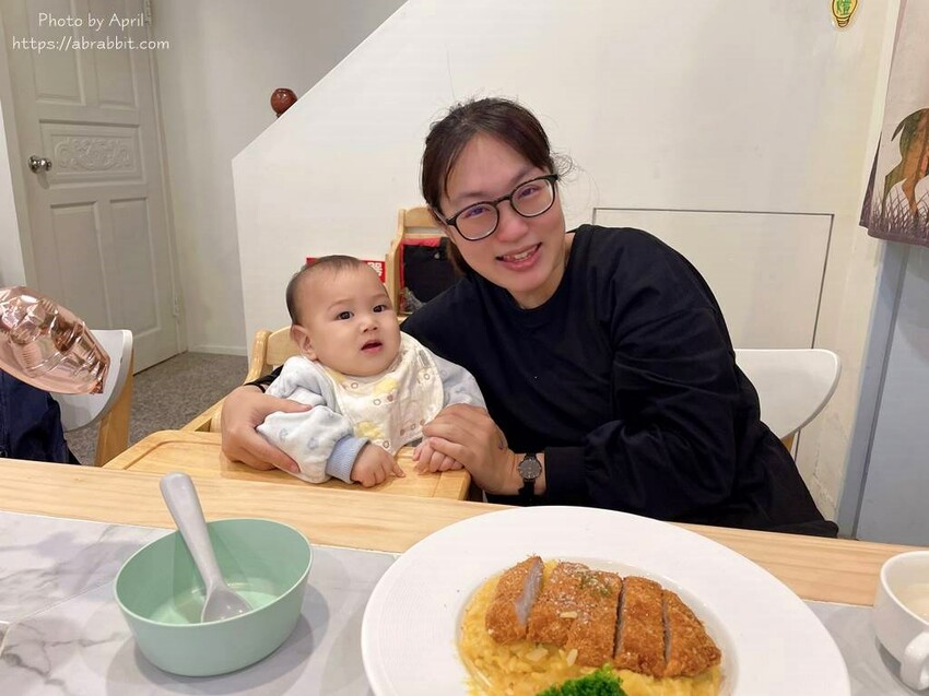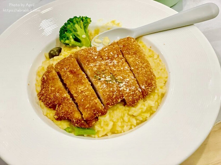 南瓜豬排燉飯,其實上面會再淋上蜂蜜芥末醬,但我請店家不要放,因為我燉飯想要餵食小胖胖牛奶糖。端上桌很開心要挖給英國寶和牛奶糖吃,舀了一口想到我忘記拍照,只好來一張缺一角的照片XDDD 照片可以看得出來豬排非常厚實,而且外皮炸得挺酥脆的,南瓜燉飯口味吃起來甜甜帶點些微的鹹,小朋友很愛。