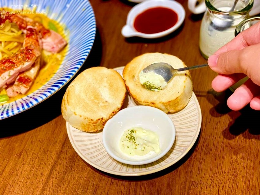 點套餐的話,有提供烤麵包、濃湯和飲品,烤麵包直接抹上抹醬吃還不賴,濃湯如果不想要加黑胡椒的話可以跟店家說。溫溫熱熱的玉米濃湯裡面也蠻多料的,配上烤熱熱的麵包,撕一小塊沾著濃湯吃也很棒。