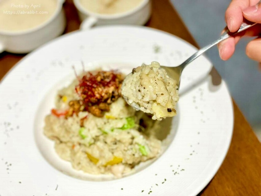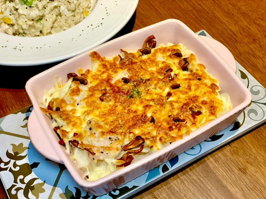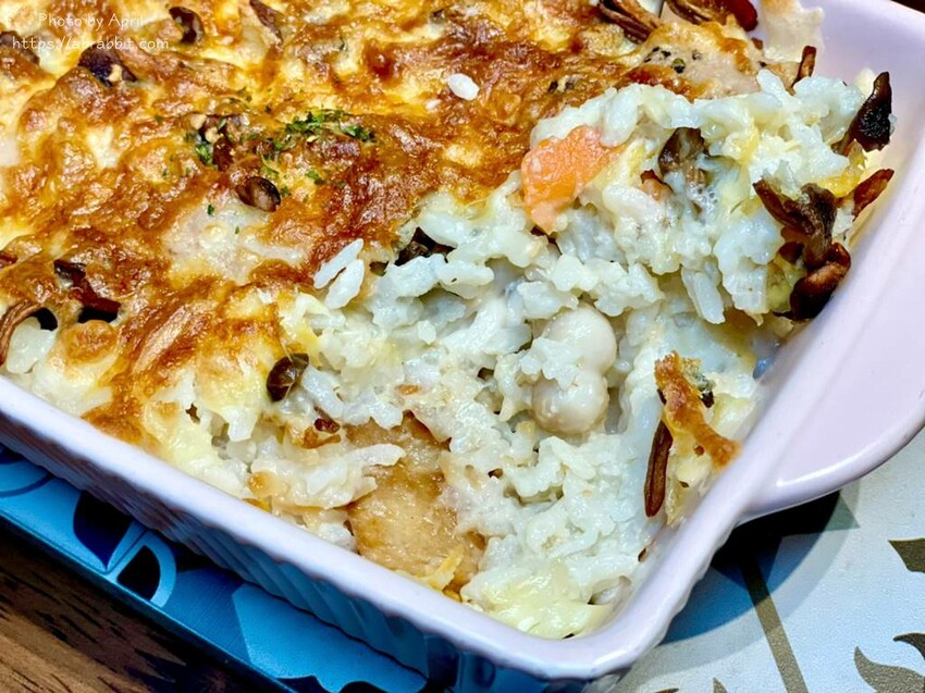 這道焗烤我覺得也很適合小朋友吃,裡面有舒肥嫩口的魚肉和蔬菜、菇類等等,料真的挺多的,我自己吃完都很撐XD 而燉飯的口感是比較軟Q的,我個人還蠻愛裡面的菌菇,烤得很香!