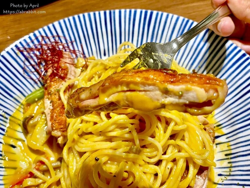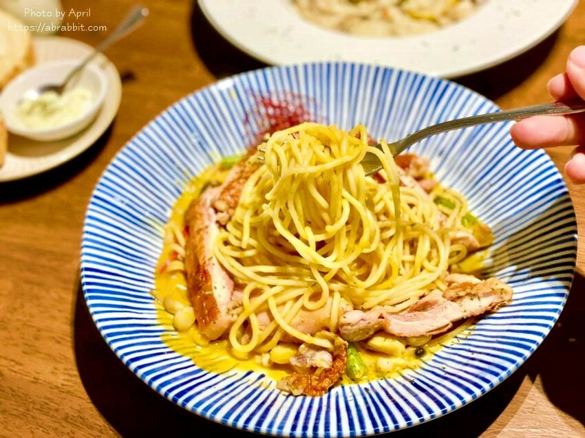 南瓜醬的顏色非常吸睛,而且香氣濃郁四溢,跳脫了以往對義大利麵紅醬、白醬、青醬以外的選擇!而且雞腿排煎得外皮恰恰看起來就好好吃,而且非常厚實的雞腿排,嫩而不柴,沾著南瓜醬一起吃也很讚。