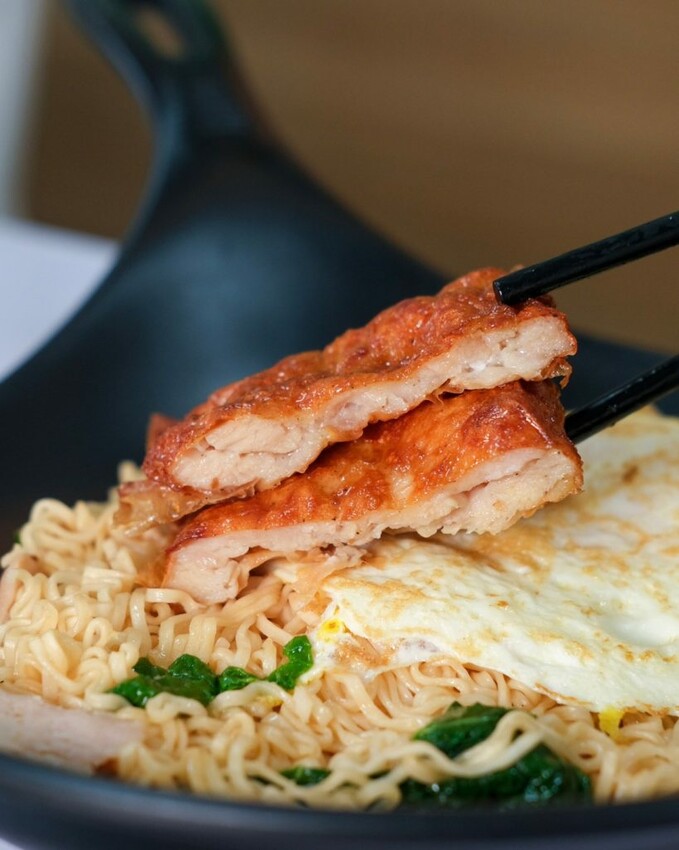 ▼早午餐店少見的貴妃雞排炒泡麵,超大炒麵再疊上荷包蛋、雞排和燻雞肉,以油蔥調味的炒麵充滿台式風格,不會軟軟爛爛,雞排手工手工包覆一層豆皮,澎派份量吃完很有飽足感~