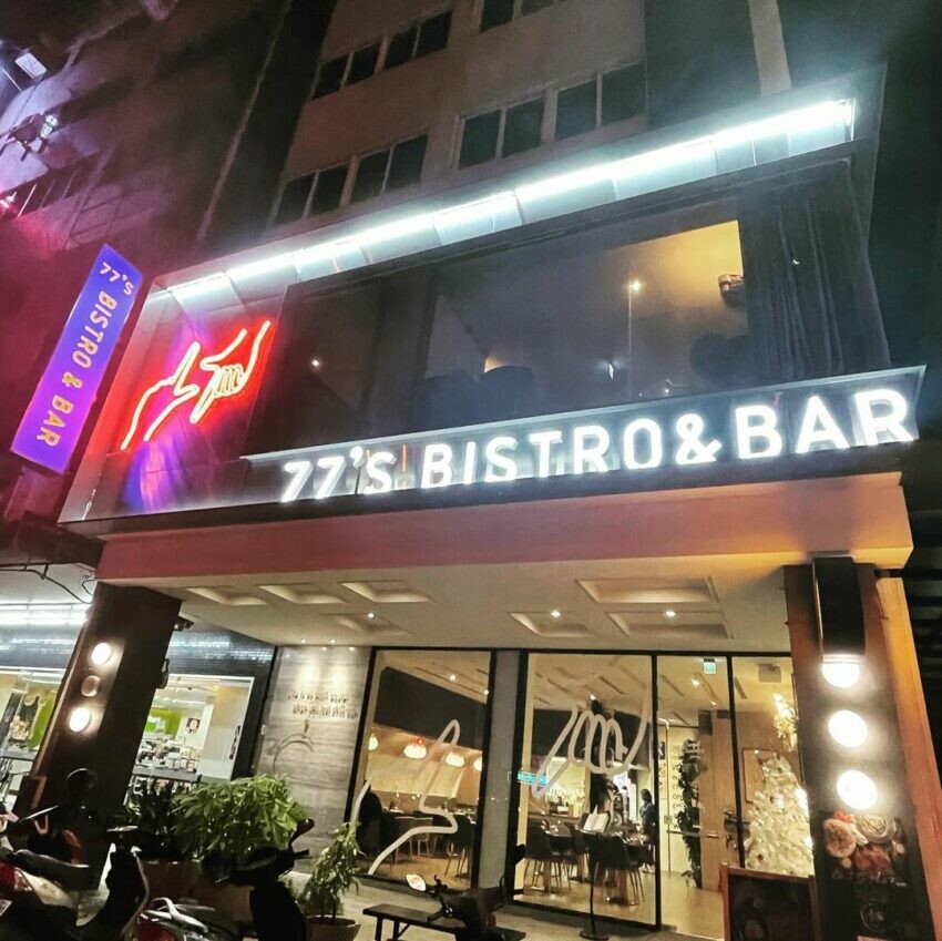 「77’s Bistro&bar」餐酒館的招牌是比七的兩隻雙手標誌,在台灣大道上十分吸睛。直接在店名上都寫了Bistro,不喝酒的朋友也可以來這裡飽餐一頓!以餐食為主的一樓裝潢也偏向餐廳的風格,整體寬敞又好拍!二樓則是規畫成酒吧空間,有吧檯也有大大的落地窗,還有很適合拍照的網美牆。飽餐一頓再上樓喝個幾杯,可以說是最愜意的生活方法了!