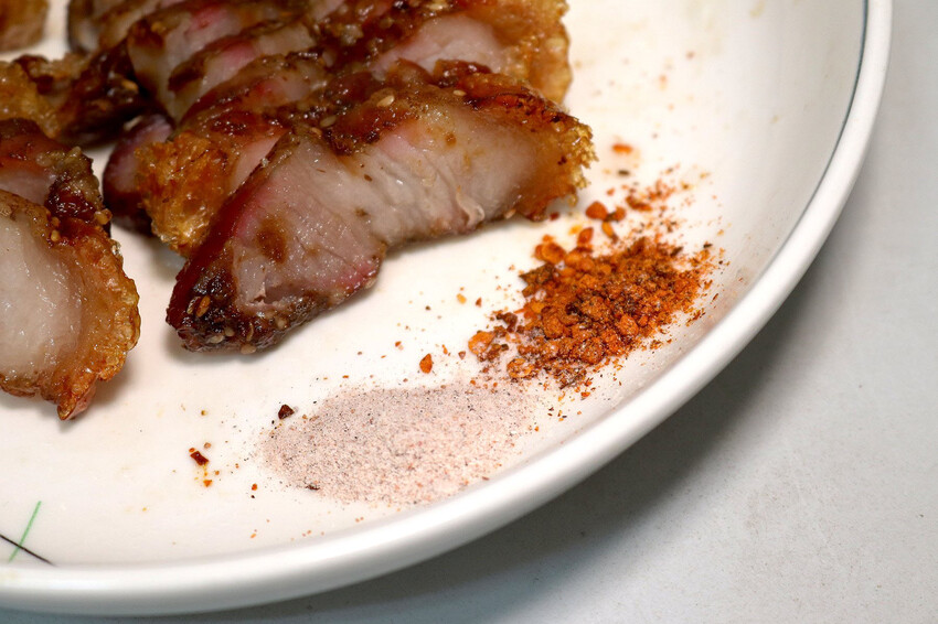選用台灣豬五花肉加上23種辛香料醃製,醃製後還要再經過至少15小時風乾,每條脆皮豬製作時間長達32小時,每日限量100條,賣完就收攤