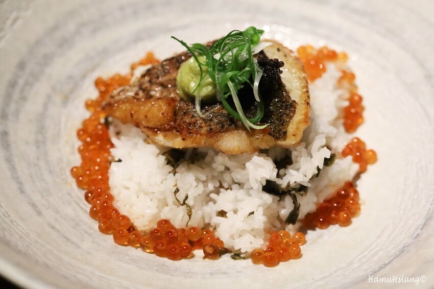 鮭魚卵鮮脆,鱸魚煎的外酥內嫩,加上口味比較重的芥末互相中和搭配很適合,鱸魚本身沒有很重的鱸魚腥味(我很怕那個味道