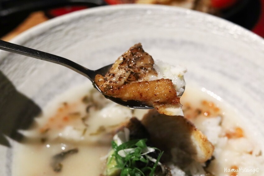 隨餐附上奶湯,鱸魚取肉,其餘部位乾煎到金黃熬製而成,加上一點芥末醬提味