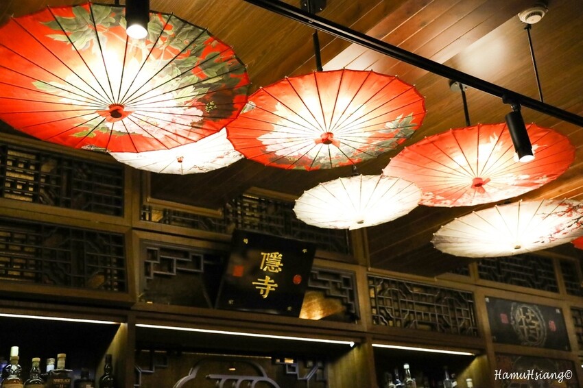 上方則有許多古風傘裝飾,非常華麗,店內處處有大型插畫,融合現代與古風,也有隨處可見的小驚喜(例如求籤.名片是平安符的概念等等)