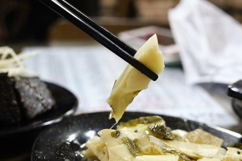 梅干菜>這是客家料理常見的菜色,但許多客家菜都會有點死鹹,這兒的鹹度剛剛好,還吃的到菜本身的香氣,有點像海帶與昆布之間的味道