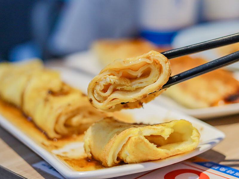 蛋餅有酥脆外皮和鬆軟蛋皮的古早味蛋餅兩種口感,任何口味只要點雙蛋升級,就可以做成鬆軟的古早味;古早味的重點在於滿滿的蛋皮當外衣,餅皮被散蛋包裹其中口感QQ彈彈,淋上特調的油蔥醬油,鹹香風味十足。