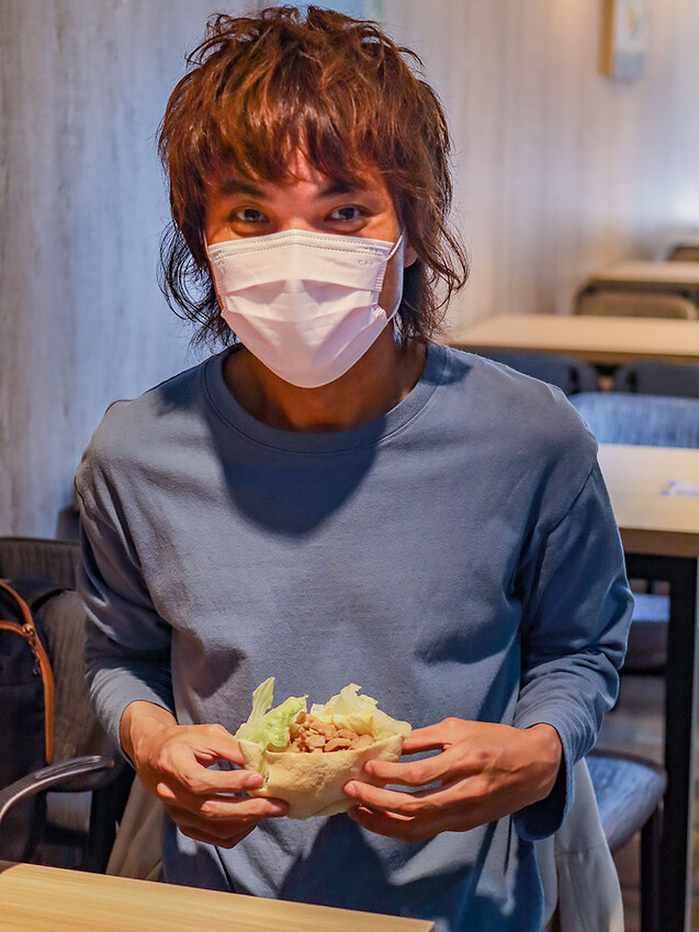 剛好我今天穿著藍色的T恤,有猜到我在扮演誰嗎 ? Pita口袋餅源自地中海料理,有點粉粉的麵香是其特別的口感,嫩煎雞柳的醃製的香料很特別,嘗一口還有點清爽的檸檬香,再加上一顆蛋,有肉有蛋營養滿分。
