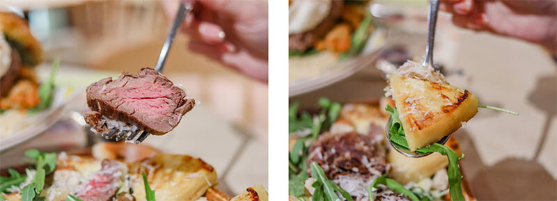菲力牛排著重肉感,有著豐富的牛肉風味,牛排中段的肉外熟內嫩可以吸吮到甜甜肉汁,兩頭的肉比較熟,但是沒關係,可以搭配有著清新果甜的炭烤鳳梨一起吃。