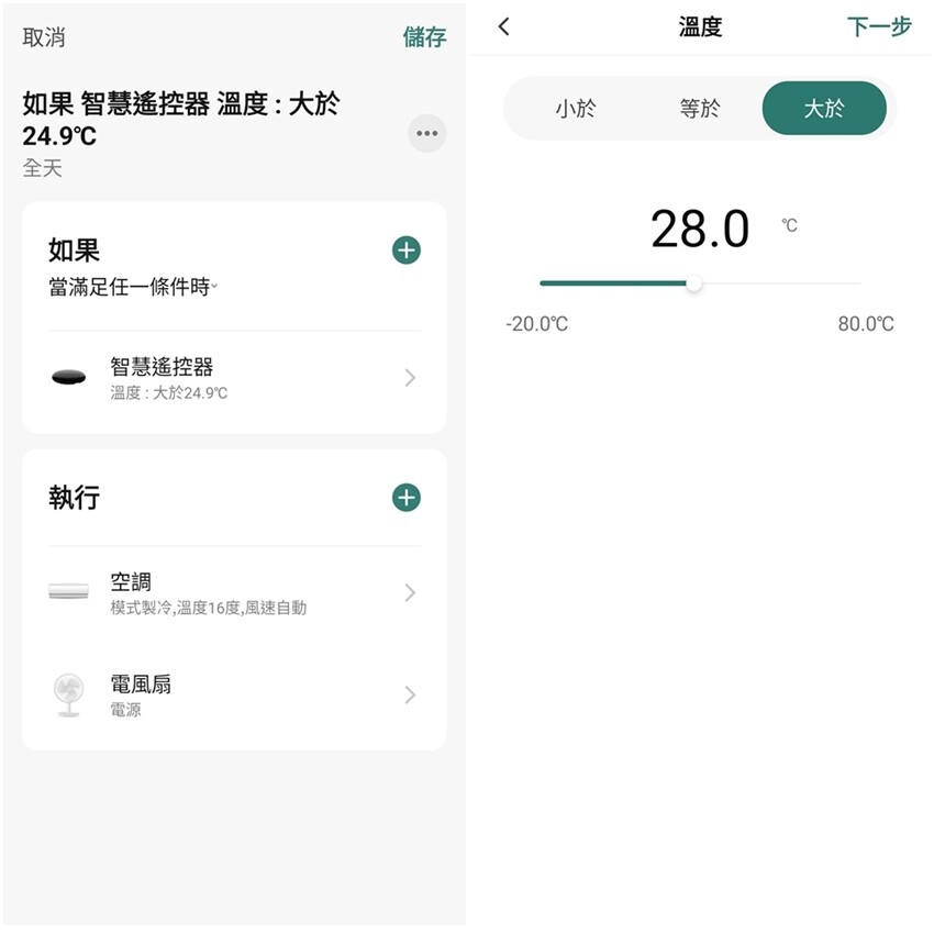 ▼如果預設冷氣自動啟閉,設定畫面如下,可以設定條件來啟動;像是有時候天氣太熱,就可以設定溫度大於28度C自動開啟冷氣,全天候都能享受舒適的恆溫空調。
