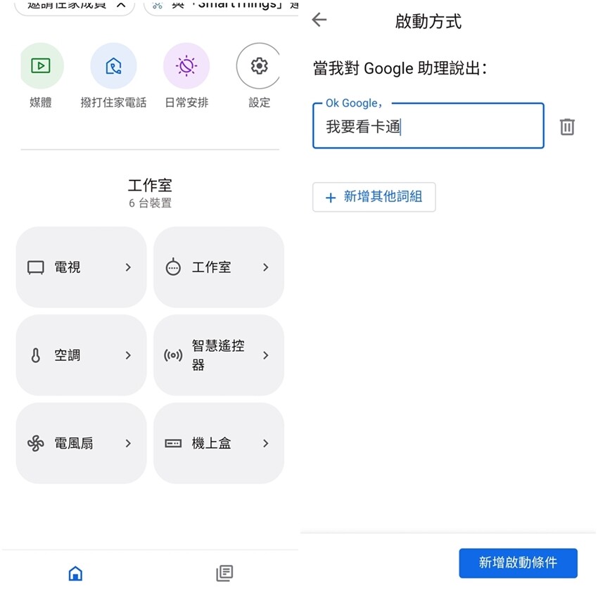 ▼最後是到”Google Home” APP 設定要說的話來連動指定,可以盡量設定簡單易懂但又不要生活中會常說到的用語,避免不小心誤說通關密語,家電就會忍不住開開關關(笑)。