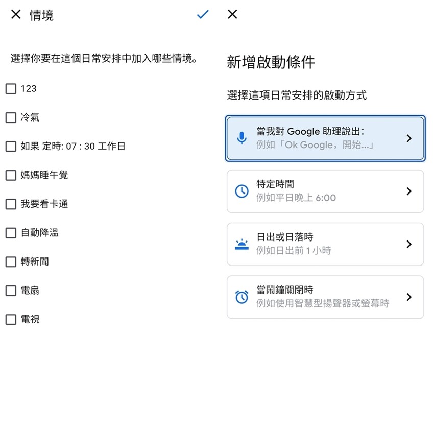 ▼另外就是使用Google Home來設定”口說的指令”,簡單的說就是設定要說什麼指令,讓音箱來連動剛剛設定好的模式。