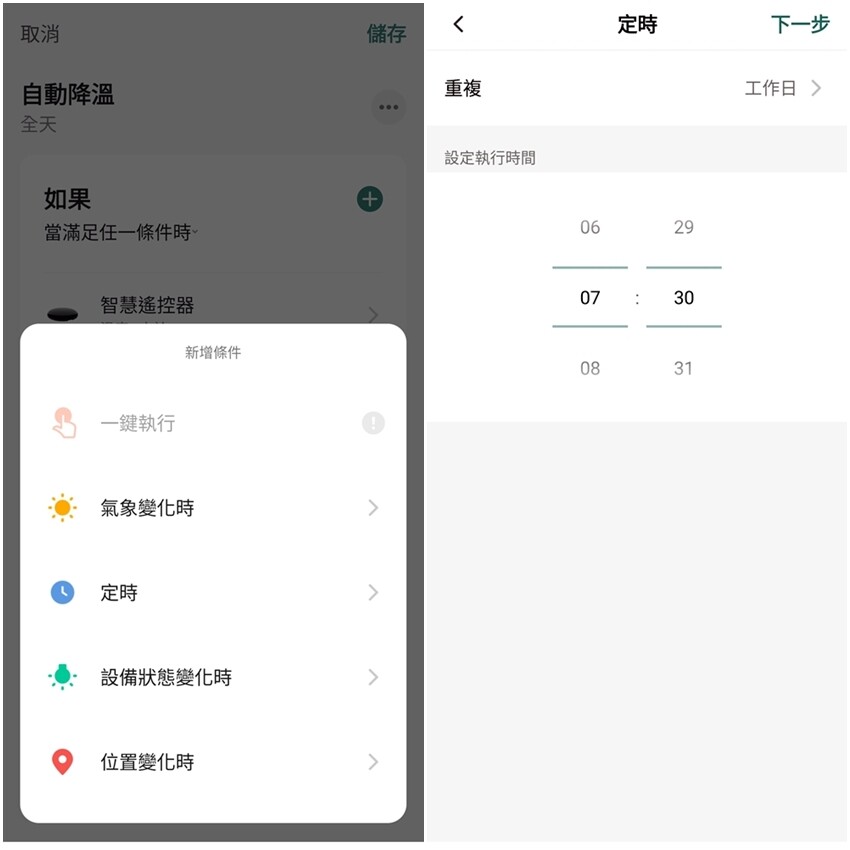 ▼如果設定時間條件,甚至可以使用時段來調整,像是可以設定小朋友睡覺時間,冷氣可以自動調整為睡眠模式,晚上也比較不用擔心會著涼。
