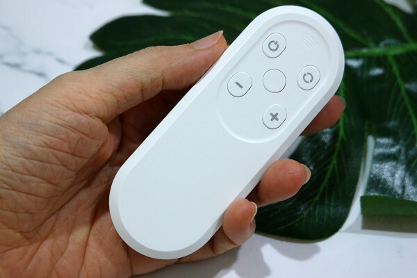 遙控器上四個按鈕分別掌控了電源開關、風扇左右擺動及增加風量、減少風量,面板不複雜的遙控器拿起來很輕、很小巧。