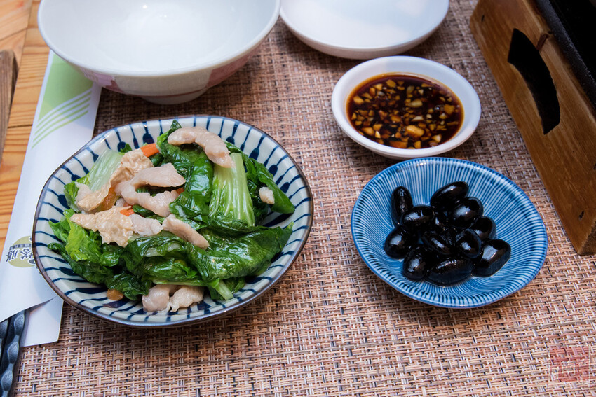 釜鍋煮的米飯,我們加價$20換成五穀米,五穀米是白米、糙米、紫米、紅米和小米五種米組成,這也是很多消費者稱的黃金比例米,當看到那紫色的米飯胃口就來了。鍋物一樣搭配炒菜和小菜,而雞肉沾醬是使用東成醬油加上蒜頭,雞肉沾上醬油帶點甘醇的味道。
