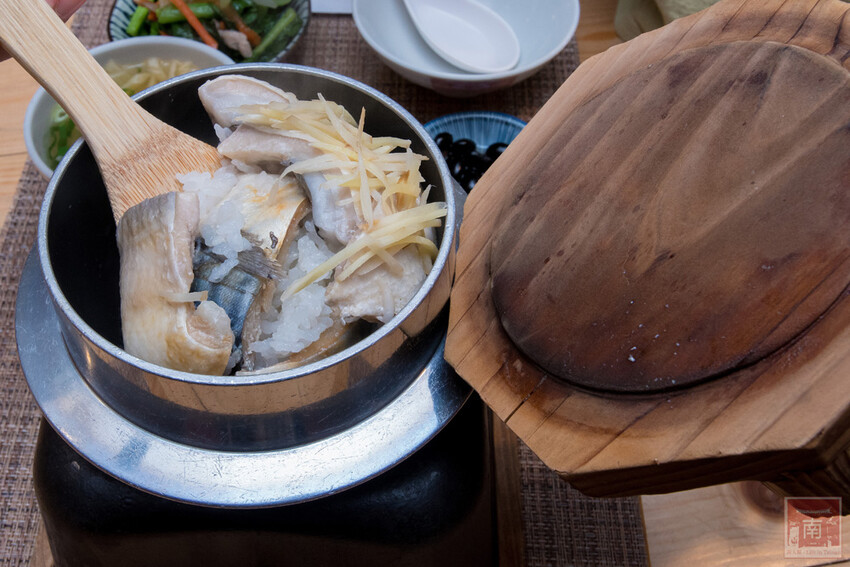 炊飯算是日式的料理,也是小編覺得來到愛搭膳必點的。像櫻花蝦芋香炊飯是使用屏東的櫻花蝦和大甲的芋頭、甘蔗鴨賞炊飯是使用宜蘭的鴨賞、麻油雞炊飯是使用屏東的麻油、花雕雞炊飯是使用花雕酒,都是使用台灣在地食材。而小編點的這份是鯖魚加上虱目魚,池上白米鋪上鯖魚和虱目魚去炊。等上20分鐘終於上桌了,而且釜鍋木蓋上也寫上開鍋的時間,一打開聞到滿滿的魚香,因為將魚直接和米飯直接一起炊,所以魚的香氣多多少少也被米飯吸收。還搭配炒菜和湯品,這次的湯品是排骨筍子湯,炒菜和湯品也都是會依照當天食材變化。