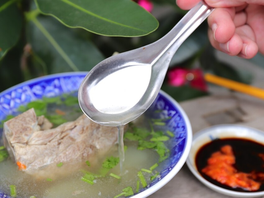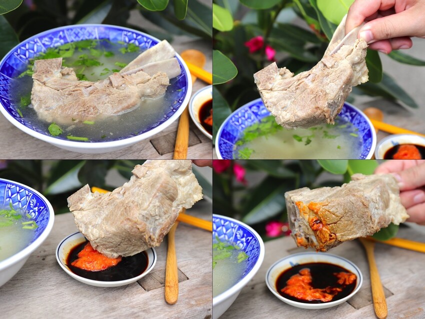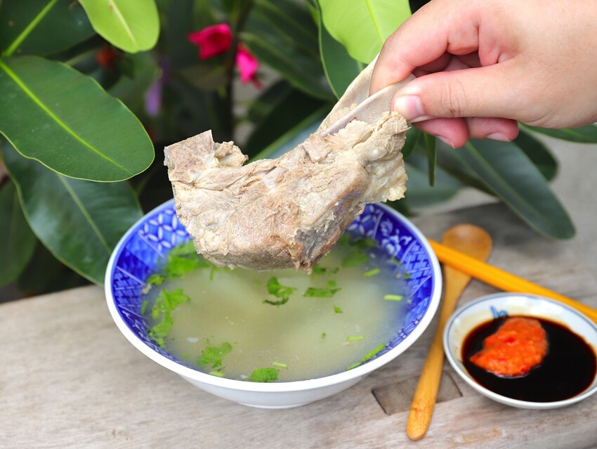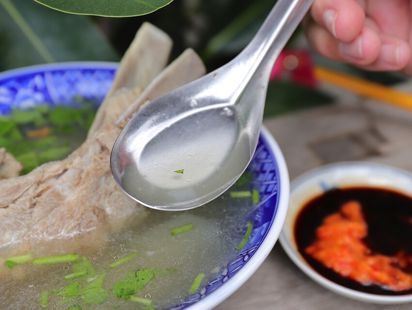 店家的原汁排骨湯也很厲害!直接給你一整支的大排骨肉,幾乎都快滿出湯碗,簡直是巨無霸等級的排骨湯,媲美戰斧豬排了!