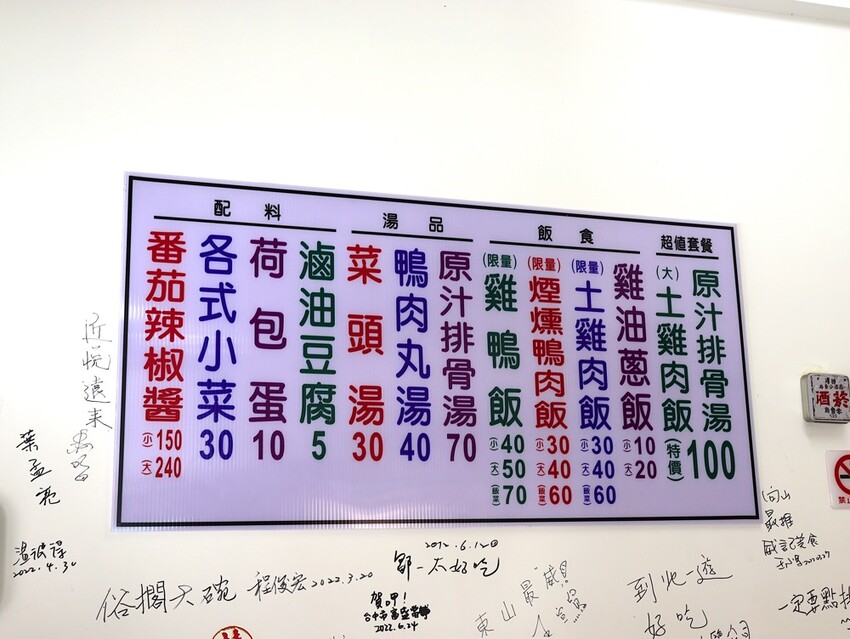 店家的品項不多,基本上就是雞肉飯和鴨肉飯兩類!(沒想到~還有雞肉和鴨肉混合的雞鴨飯!如果兩種都想吃的話就可以點這種雞肉和鴨肉混合的)湯品的部分有三種。簡單的飯食,用心做好,就能成為讓人再三回味、記憶中的家鄉味!